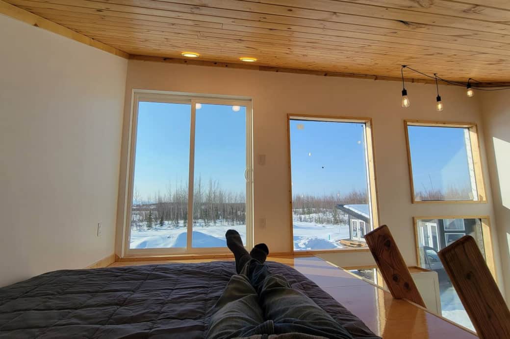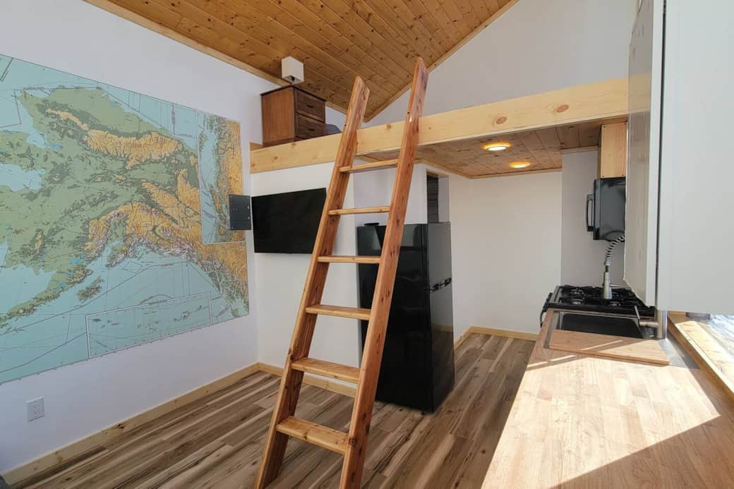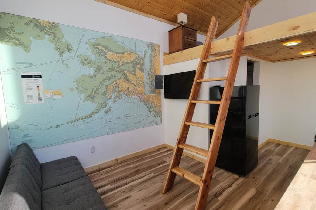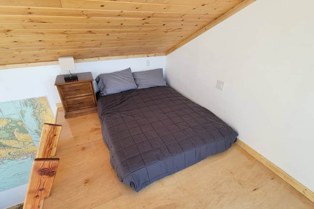 Your 300sqft tiny house cabin is located alongside our private runway with mountain views on the 100 acre Pilot Lodge. This tiny house comes complete with a full bath, rain-head shower, full kitchen, futon, and super comfy queen sized bed. Arrive by car or by bushplane. Enjoy the private trails, disc golf course, and fire pit. A full size washer and dryer are available in a separate cabin for your use. There is one queen sized bed, and a futon couch for up to 4 guests.